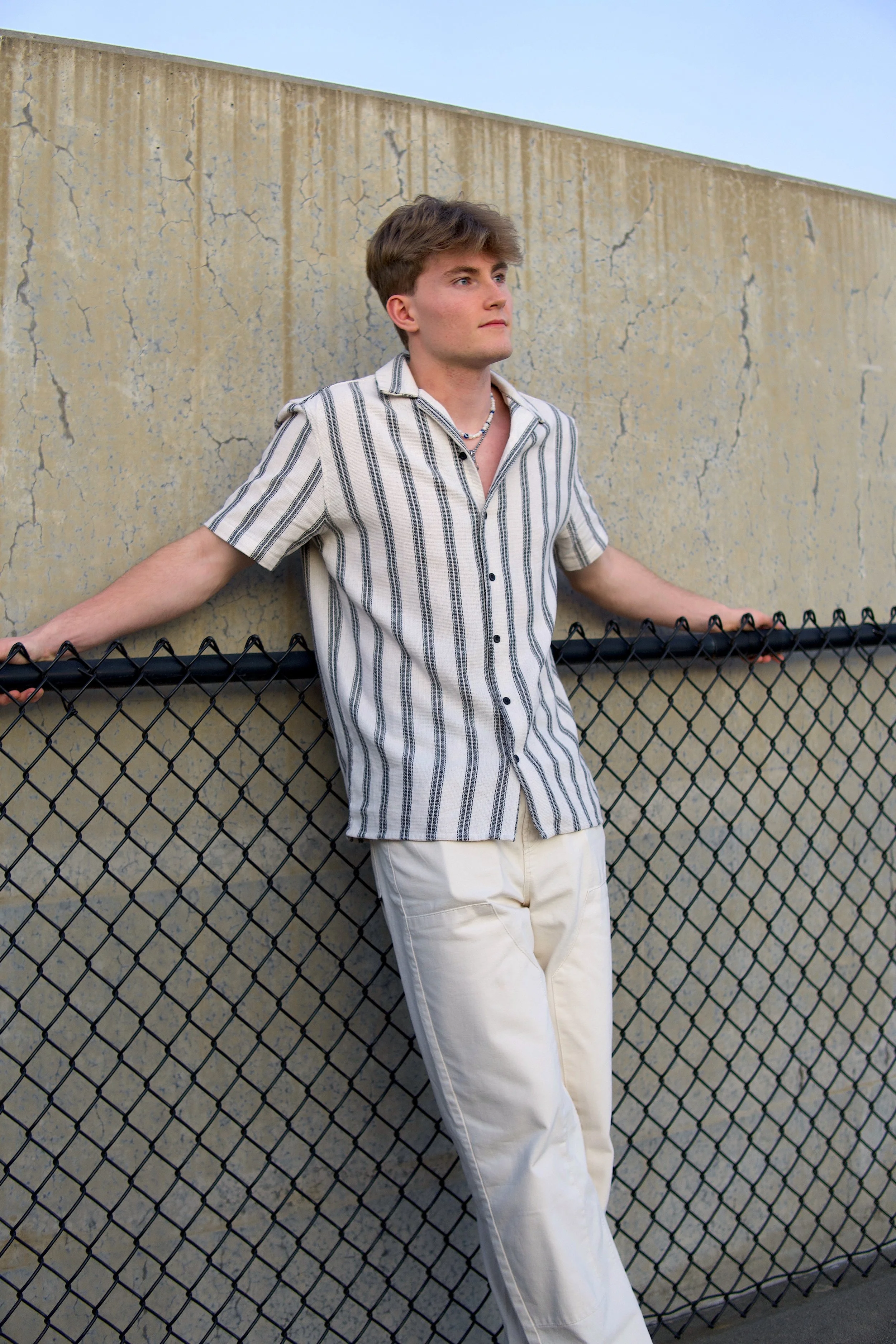 A young man with brown hair and fair skin leaning against a chain-link fence, wearing a short-sleeved striped shirt and light-colored pants, standing outdoors against a weathered beige wall.