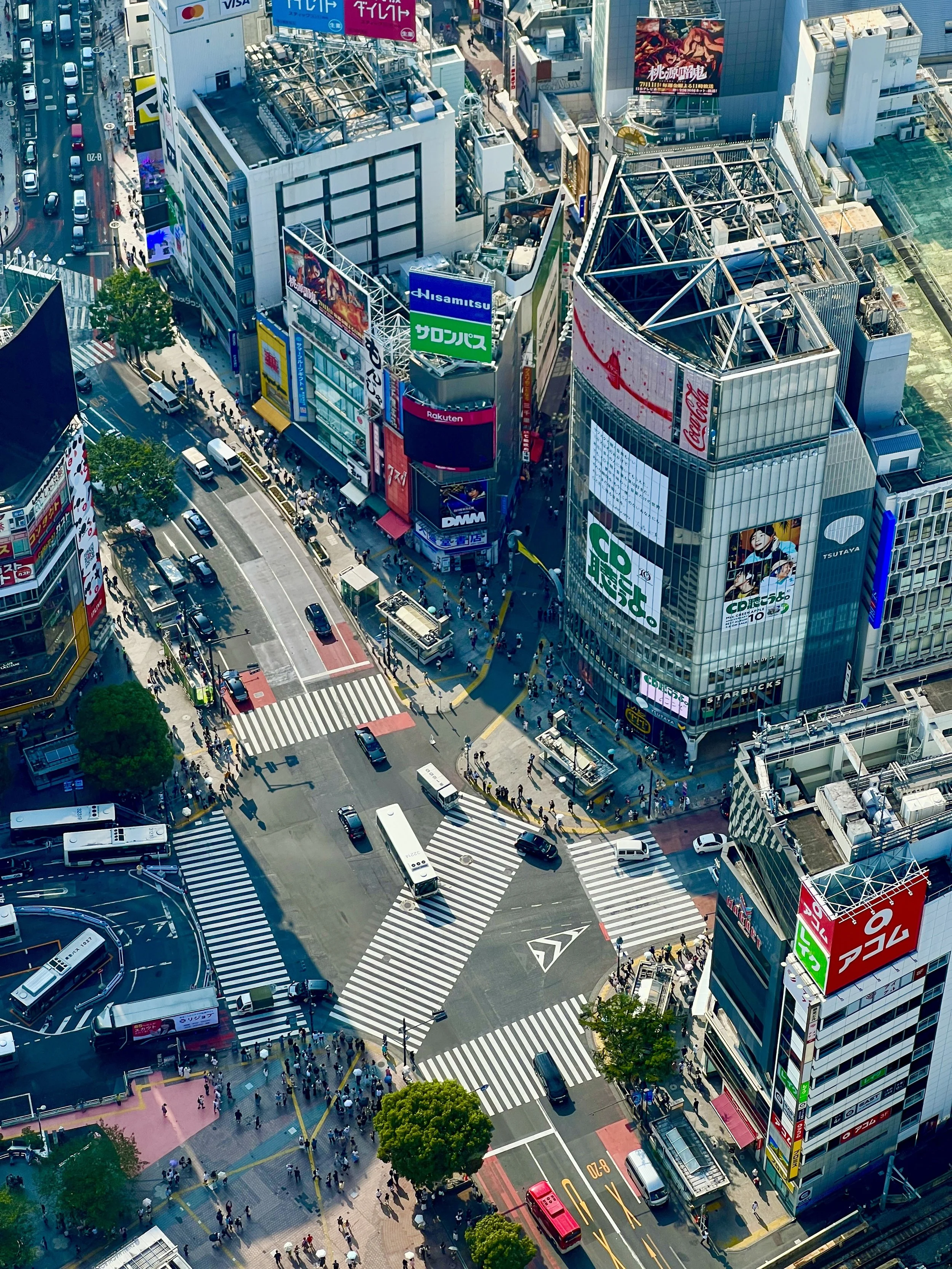 An aerial view of a busy city intersection with crosswalks, cars, buses, pedestrians, and tall buildings covered with colorful billboards and advertisements.